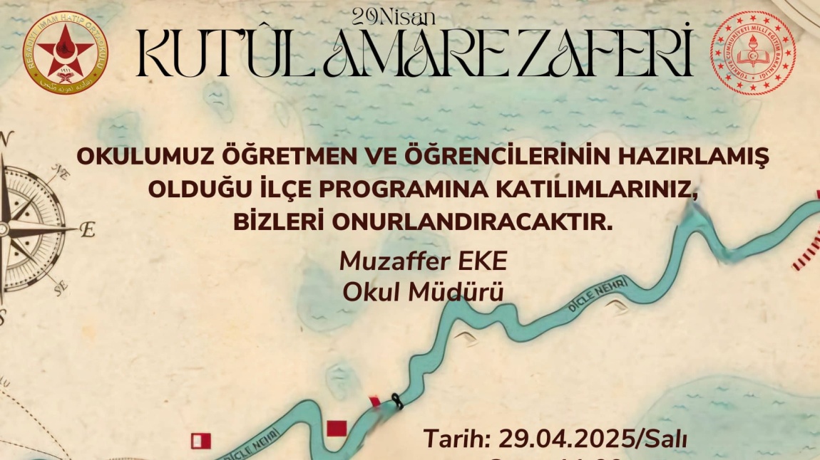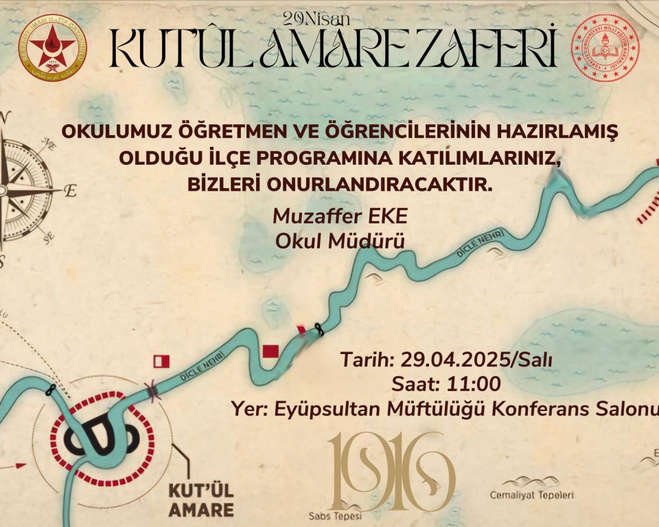 Okulumuz Reşadiye İHO tarafından Kut'ül Amare zaferinin 109. yıldönümü vesilesiyle ilçe programı düzenlenecektir. Tüm öğretmenlerimiz, velilerimiz programımıza davetlidir.